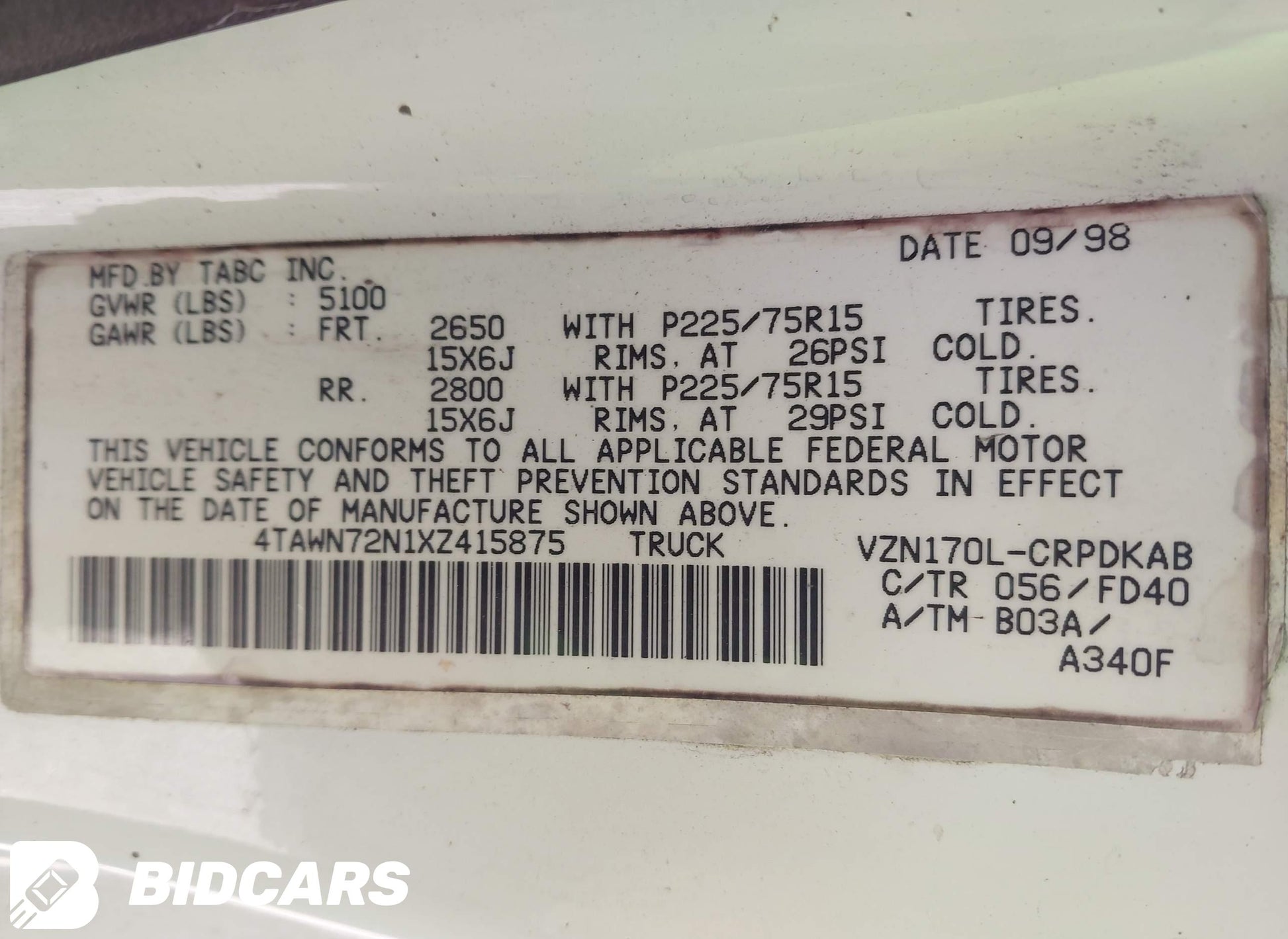 VIN: 4TAWN72N1XZ415875